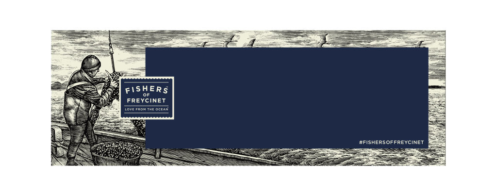 Together we investigated the ‘brand story’, with discussion revolving around the pristine waters of Freycinet Peninsula in which Fishers of Freycinet grow, nurture, and harvest mussels. The recurring theme decided on was: “love from the ocean,” this being the essence of the brand. The chosen design direction was one of energy and hard work shown in ‘wood cut’ illustrations inspired by Raymond Shepard’s illustrations in Ernest Hemmingway’s “The old man and the sea”.