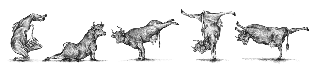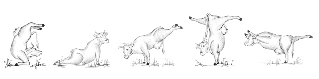 With this type of inspiration, next came creating. For this, I sketched a series of healthy cows, attempting a variety of yoga poses. Of these, five were chosen to represent the brand. For the “premium” finish an Artist was commissioned to apply an ‘engraved’ texture to the sketch.